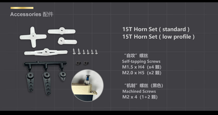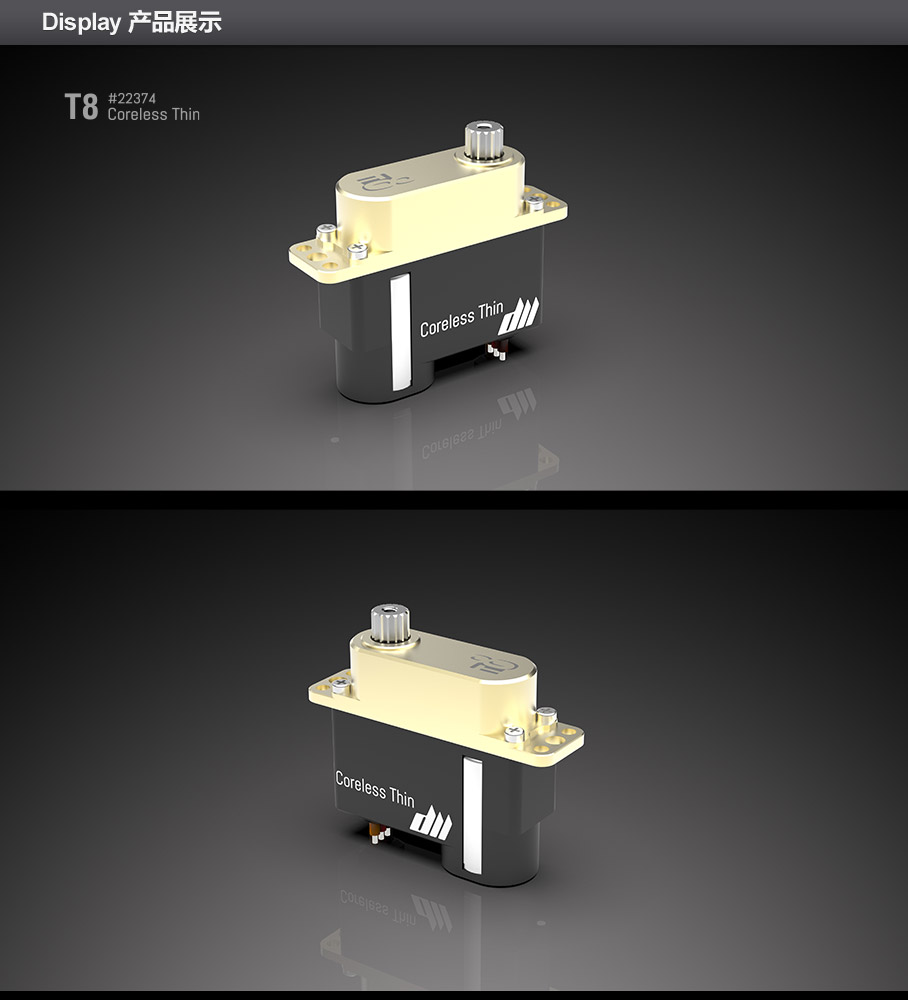 (3.8V) 3.0 Kg·cm, 0.15 sec/60° (6.0V) 4.8 Kg·cm, 0.11 sec/60° (7.4V) 5.6 Kg·cm, 0.09 sec/60° (8.4V) 5.9 Kg·cm, 0.08 sec/60° |