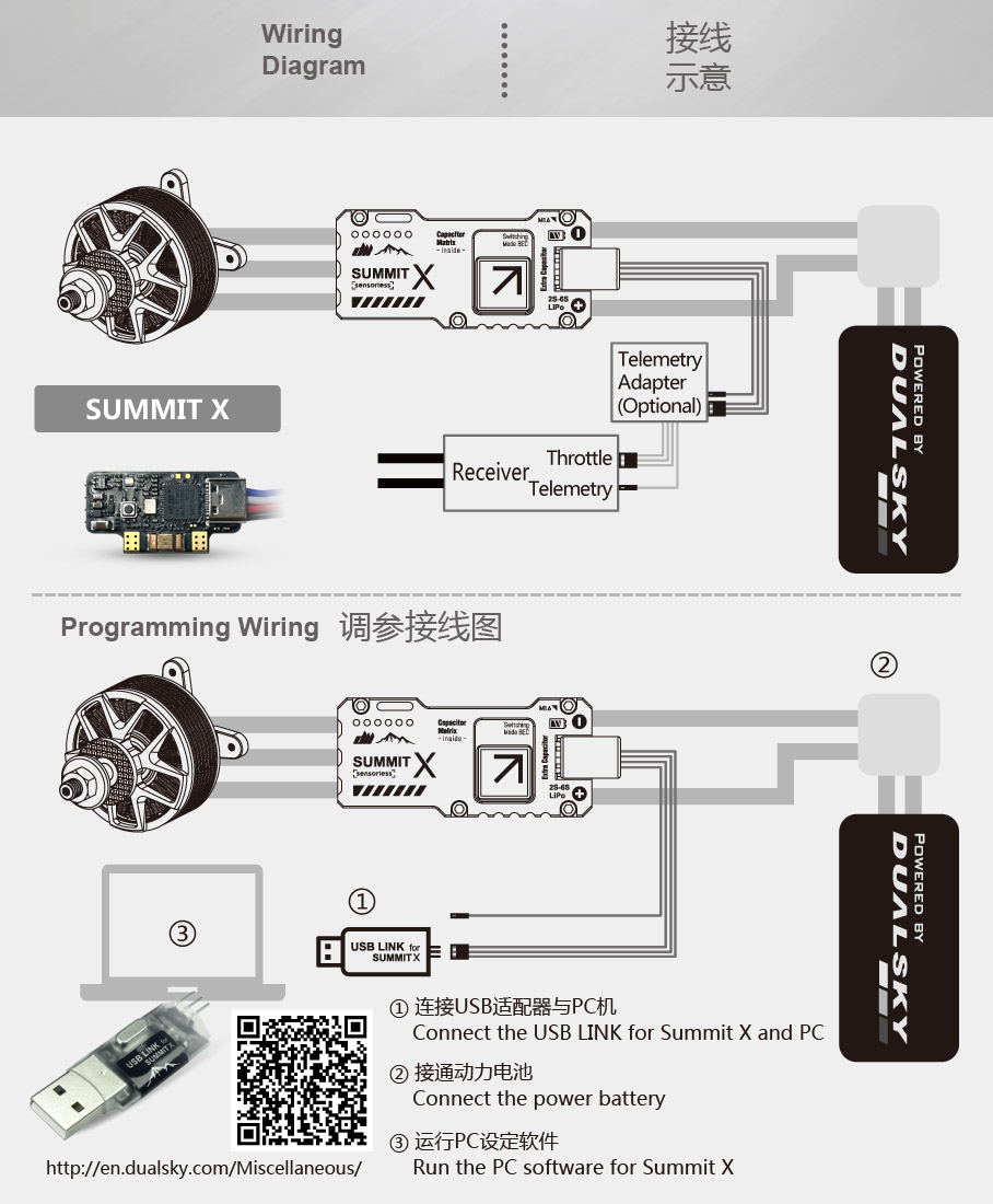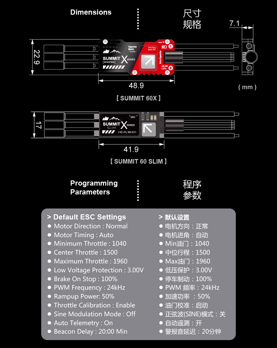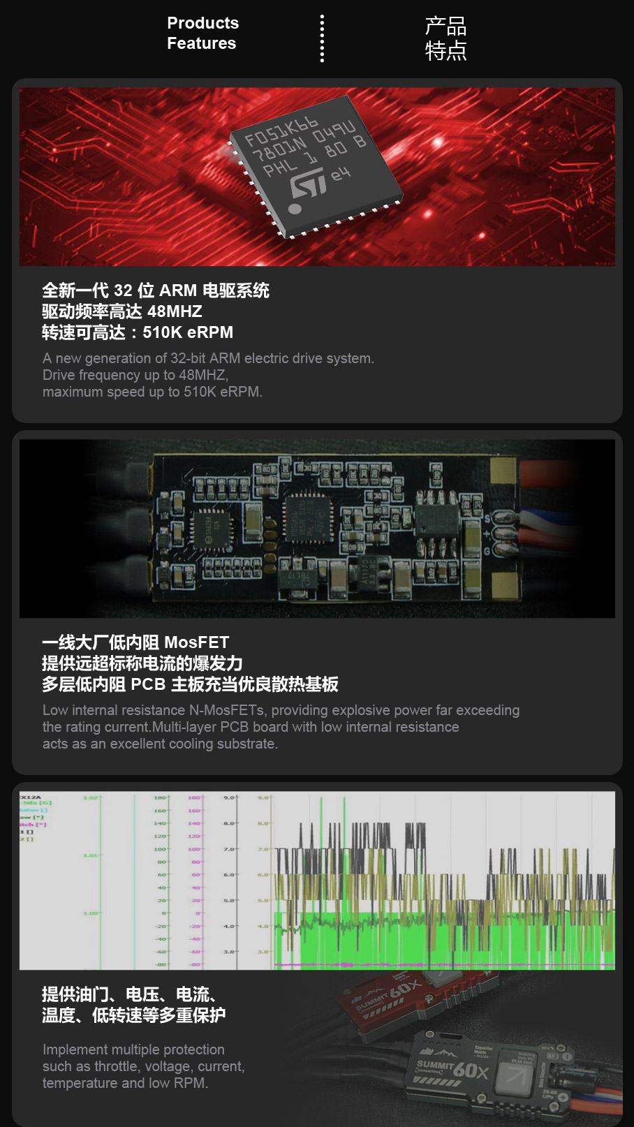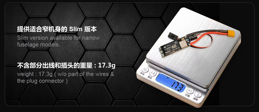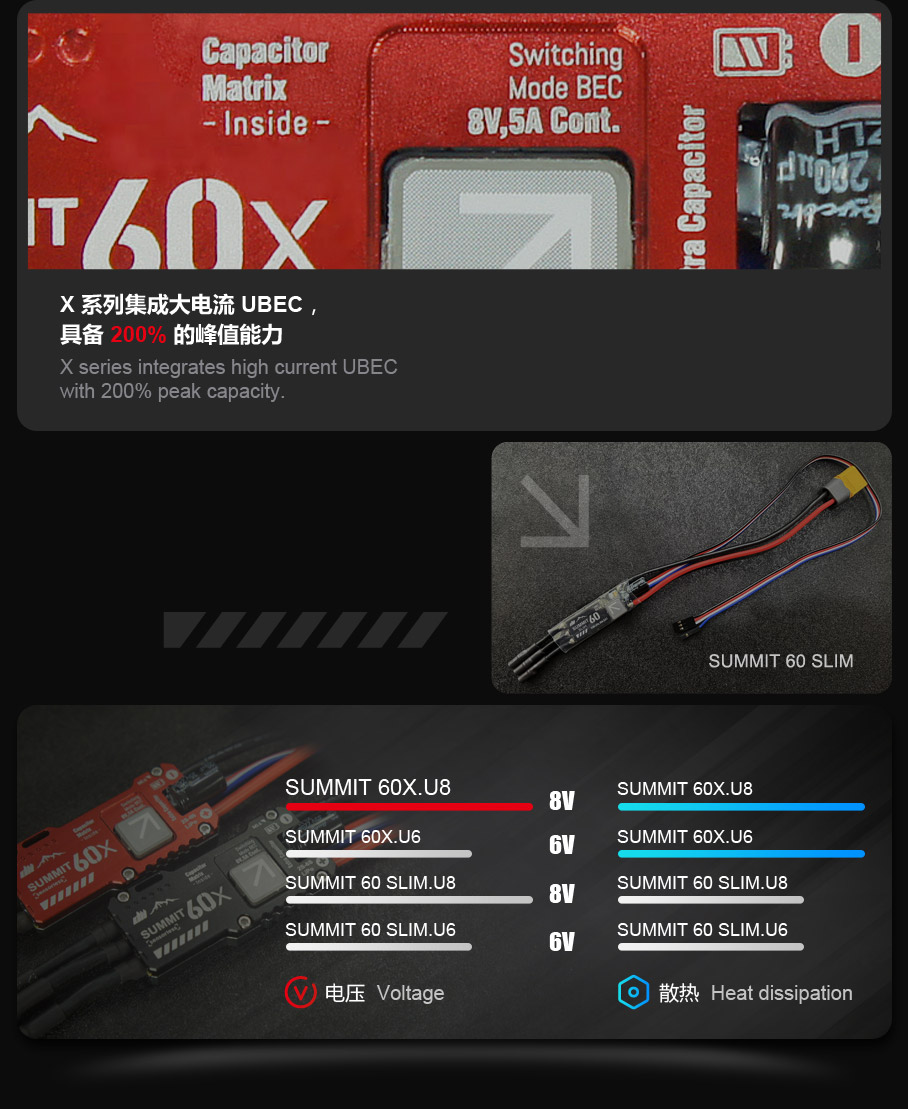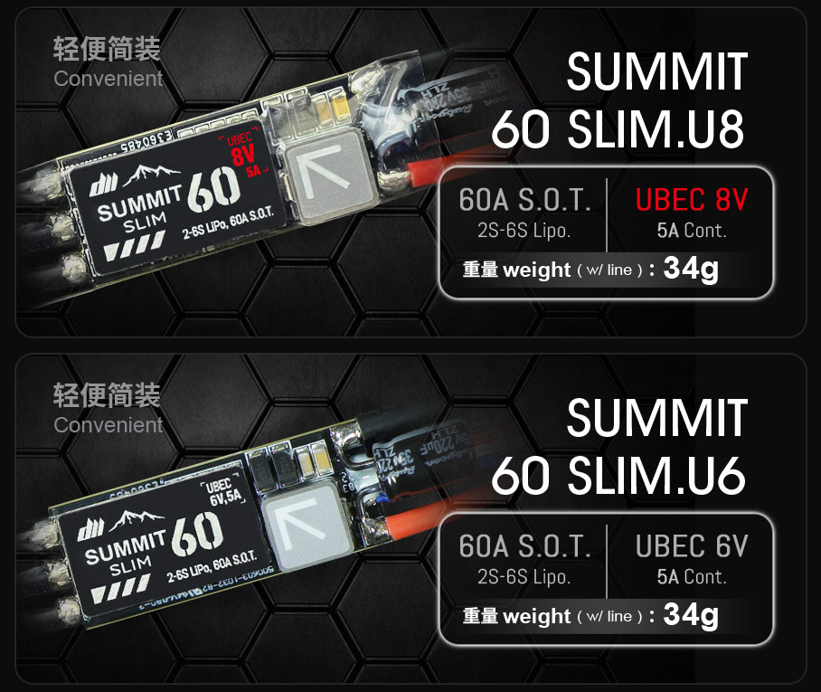 SUMMIT 60 SLIM U6 - Slim design, 60 amps S.O.T.(Short Operating Time), 2S-6S Lipo - UBEC 6V, 5A Cont./10A Peak - 32-bit ARM core, supports EA, GA motors - Fully programming |