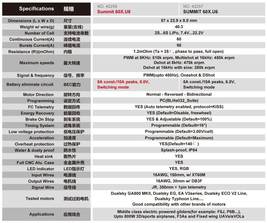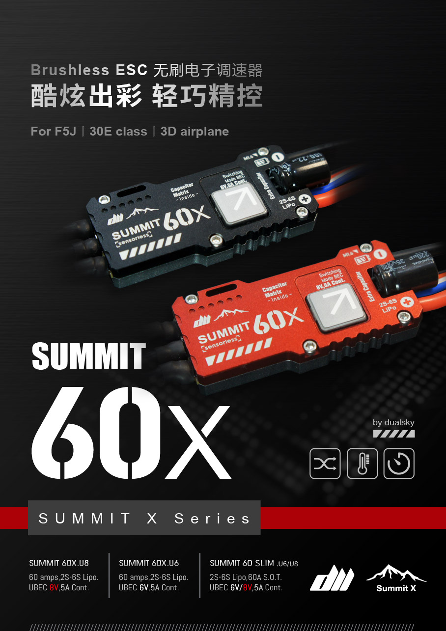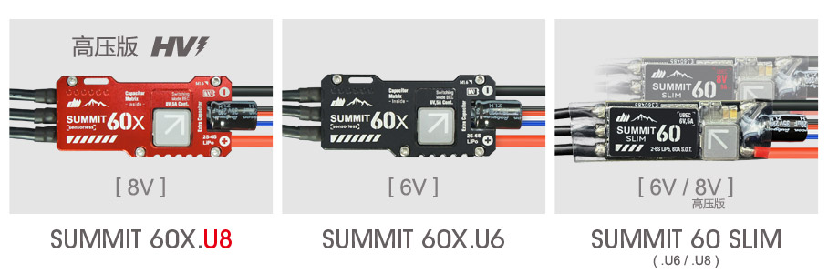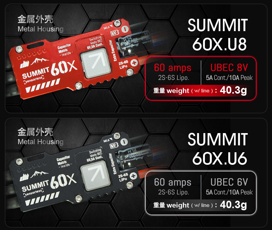SUMMIT 60X.U8 - 60 amps, 2S-6S Lipo - UBEC 8V, 5A Cont./10A Peak - Full CNC ALU. cases - 32-bit ARM core, supports EA, GA motors - Fully programming |