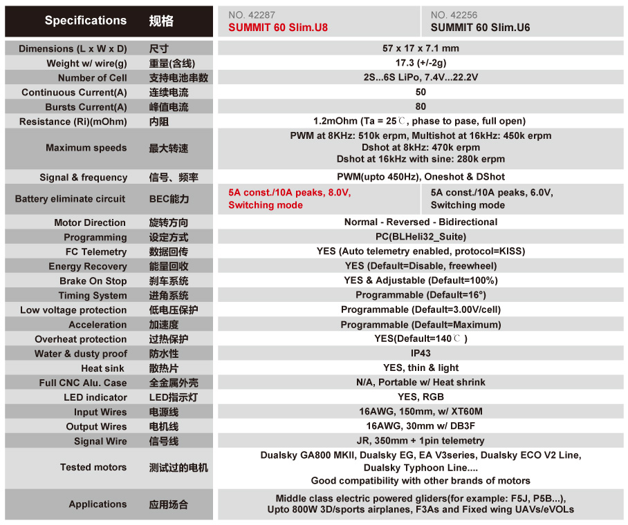 SUMMIT 60 SLIM U8 - Slim design, 60 amps S.O.T.(Short Operating Time), 2S-6S Lipo - UBEC 8V, 5A Cont./10A Peak - 32-bit ARM core, supports EA, GA motors - Fully programming |